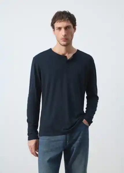 Bajo Recto Cuello Redondo Con Cierre de Botones Estilo Henley Manga Larga Slim Fit Tejido Mezcla de Lino - 27035965_56.