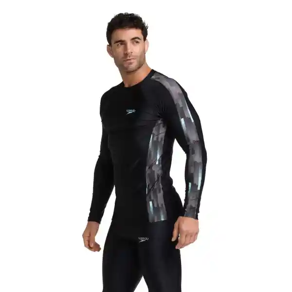 Dentro Nuestra Línea de Ropa Para Natación Diseñamos la Camiseta Protección Solar Marine Dot Linear Para Hombre Ideal Para Usar en la Piscina y Bajo el Sol. Nuestra Camiseta Negra Cuenta Con Factor de Protección Upf 50 Que Bloquea el 98% de Los Rayos Del Sol Brindando Protección Uv (De Los Rayos Uvb y Uva). Esta Camiseta Manga Larga de Protección Solar Negra Con Diseño Moderno y Elegante de Franjas Laterales en la Cintura y en Los Brazos y Logo Speedo Pequeño en el Frente Cuenta Con Ojal de Cinta de Poliéster en la Parte Inferior Interna Que te Permite Ajustar tu Sunshine a Prendas Inferiores Evitando Que se Muevan o Deslicen Mientras Realizas tu Actividad Acuática Preferida. Puedes Usarla Acompañada de tu Pantaloneta de Baño Speedo o Leggings de Protección Solar Preferido Para Que Tengas Protección Contra Los Rayos Uv50. Detalles:- Camiseta Manga Larga de Protección Solar- Ojal de Cinta de Poliéster Para Sujetar tu Sunshine a la Pantaloneta - Prenda Elástica y de Secado Rápido - Protección Upf 50 Que Protege al Menos Del 98% de Los Rayos Uv - Cuello Redondo - Silueta Slim Fit