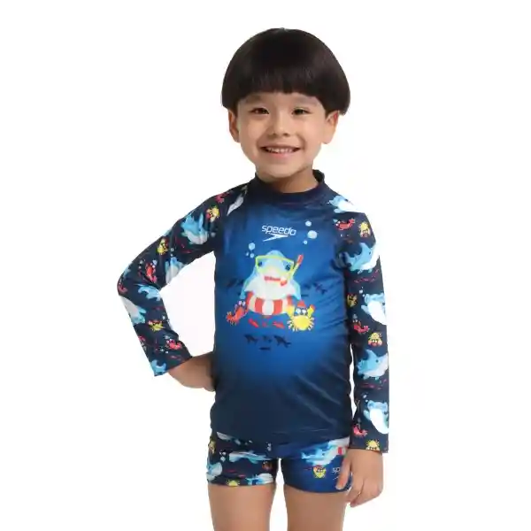 Protección Solar Sharky Splash Bebé Masculino Para Niños de 2 a 6 Años Está Diseñada Con Los Más Altos Estándares Calidad Para Brindar Comodidad y Protección en el Agua y Bajo el Sol a Los Más Pequeños ya Que Cuenta Con Factor de Protección Upf 50 Que Bloquea el 98% de Los Rayos Del Sol Brindando Protección Uv (De Los Rayos Uvb y Uva). Una Camiseta Manga Larga Azul Con Estampado Animado de Tiburon Buceando y Logo Speedo Blanco Con Estampado Multicolor de Animales Marinos en Las Mangas. Ideal Para Los Pequeños Más Aventureros. Puede Usarse Como Conjunto Acompañado de la Pantaloneta de Baño Aquashort Sharky Splash Bebé Masculino Para Brindar Protección Extra a tu Pequeño de Los Rayos Del Sol.