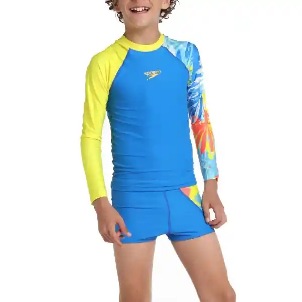 La Camiseta Protección Solar Punch Palm Junior Masculino Para Niños de 6 a 14 Años Está Diseñada Con Los Más Altos Estándares Calidad Para Brindar Comodidad y Protección en el Agua y Bajo el Sol ya Que Cuenta Con Factor de Protección Upf 50 Que Bloquea el 98% de Los Rayos Del Sol Brindando Protección Uv (De Los Rayos Uvb y Uva). Una Camiseta Manga Larga Azul Clara Con Logo Speedo en el Frente y un Llamativo Estampado Multicolor Con Amarillo en Las Mangas Que le Brindan un Diseño Único y Diferenciado. Nuestra Camiseta de Protección Solar Puede Usarse Acompañado de la Pantaloneta de Baño Aquashort Punch Palm Junior Masculino Para Protegerlo de Los Rayos Del Sol.