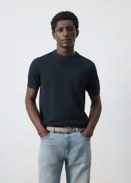 Bajo Recto Cuello Redondo Cuello Mangas y Bajo Acabados en Canalé el Color Azul Celeste y Negro Son Exclusivos Online Manga Corta Slim Fit Tejido de Punto Fino Con Microestructura Tejido Mezcla de Algodón - 27095938_56.