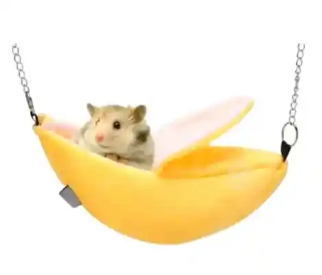 Esta adorable camita para hámster con diseño de banano ofrece un espacio cálido, suave y seguro para que tu pequeño peludo descanse o se esconda. Su interior afelpado brinda confort térmico, mientras que su sistema colgante añade entretenimiento y estimulación al entorno. Perfecta para hámsters, jerbos y pequeños roedores que necesitan un refugio cómodo y divertido dentro de su jaula. Colores sujetos a disponibilidad de inventario