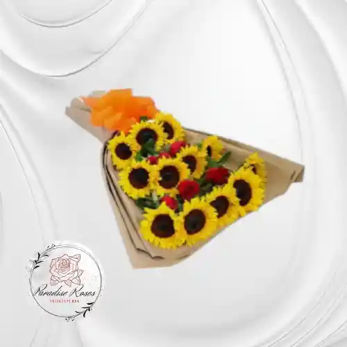 Espectacular ramo grande de 10 girasoles acompañados de 6 rosas rojas, ideal para: Regalos especiales, Celebraciones, Cumpleaños, Detalles inolvidables.