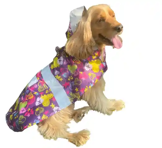 Capa Impermeable Con Diseños Estampados Corazones Morados, Fáciles de Usar, Poner y Limpiar. Con Cinta Reflectiva Que Permite Visualizar al Peludo en Las Noches y Así Evitar Accidentes. Perfectas Para Lluvias Ligeras o Chubascos, Con Abertura Para el Collar y Tiras Ajustables en el Cuello y el Pecho Del Peludo.