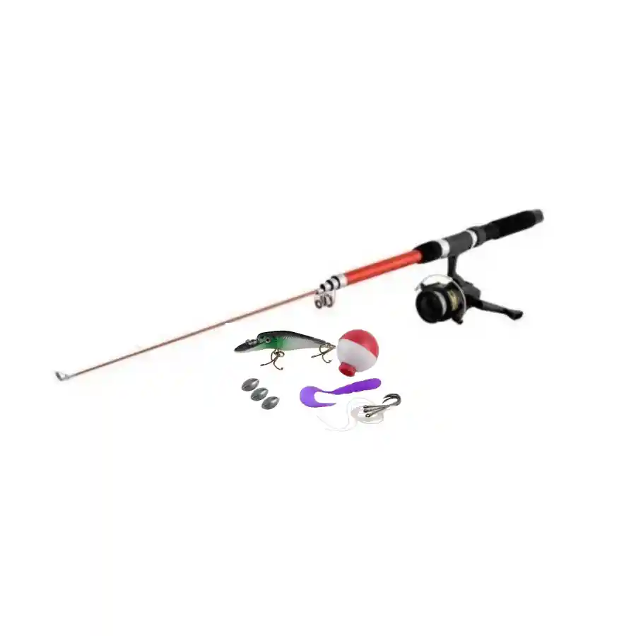 CAÑA DE PESCAR CON CARRETE Y ACCESORIOS - Largor de caña 2.1 m - Carretera en línea abierta con sistema anti-bloqueo - Manivela de 2 posiciones - Caña de fibra de vidrio y ojillos reforzados Incluye: 1 caña 1 carrete 1 señuelo 1 flotador 1 cebo falso 3 plomadas 5 anzuelos con línea -----------------> TIENDA OFICIAL MEGAFERR COM SAS <-----------------