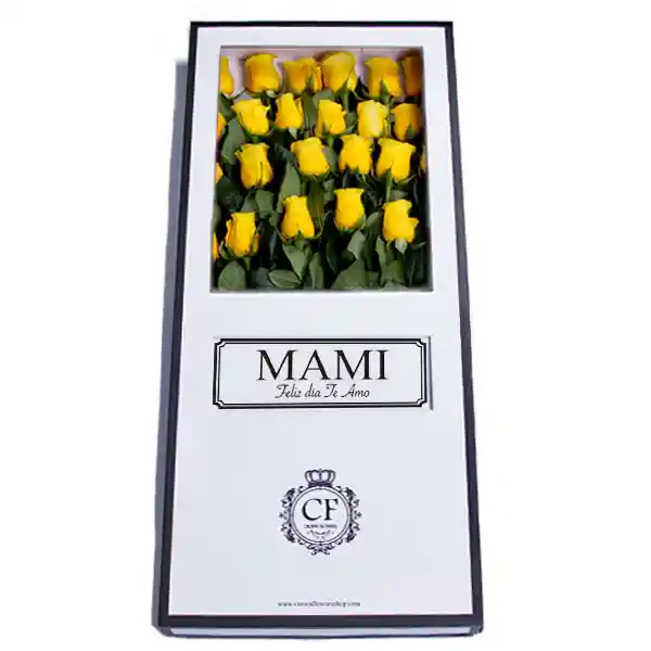 !Lujosa caja con rosas de casi un metro! Contiene 24 rosas amarillas de exportación presentadas de manera elegante en esta caja de 78cm x 34cm, ideal para causar una gran impresión. El estuche cuenta con una ventana en la tapa donde va el sticker de tu elección, y una tarjeta con sobre adentro del estuche donde va el mensaje dedicatorio. ELIJE EL MENSAJE STICKER: "Te amo con todo mi corazón" ; "Feliz cumpleaños" ; " Feliz dia con mucho cariño" ; " Mami eres el regalo más grande " ; " Mami feliz dia, te amo"