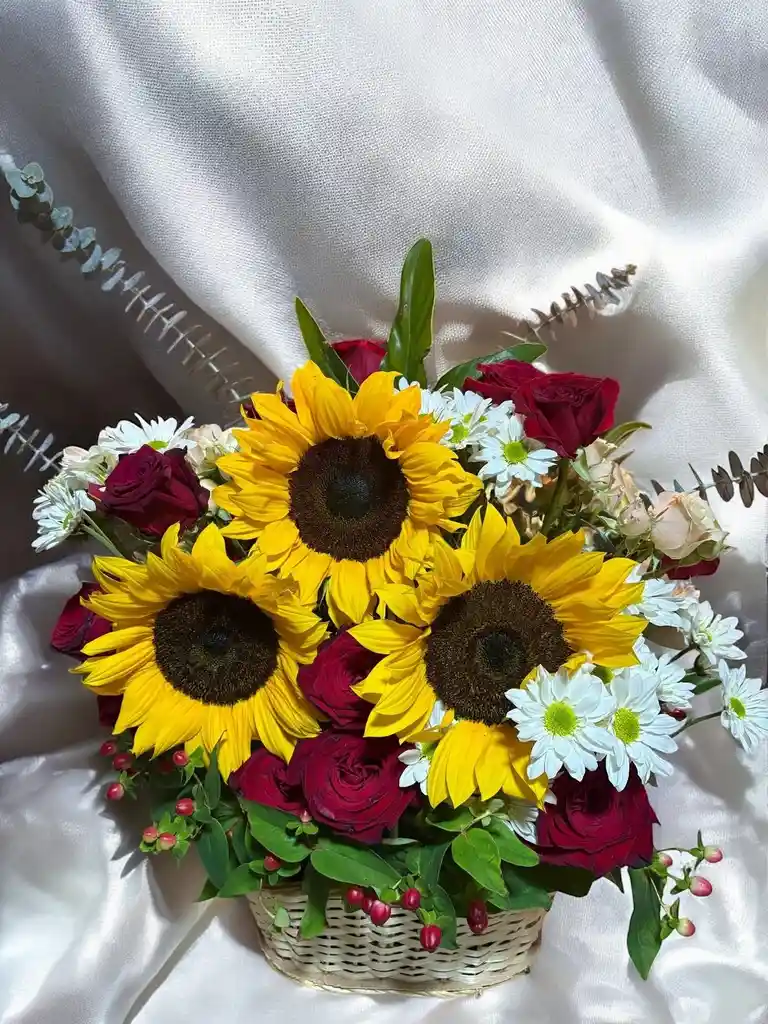 Canasta mediana de rosas rojas, con 3 girasoles y margarita blanca, acompañada de follaje. Nota: La flor puede ser sustituida dependiendo la disponibilidad de color y del producto “Mensaje Personalizado” máximo de 30 caracteres (Dejar el mensaje en el chat, los comentarios no se previsualizan para la tienda por lo que si se dejan allí no podrá ser incluido).