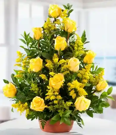 Canasta de 12 rosas amarillas con 20 varas de diferentes follajes . La flor puede ser sustituida dependiendo la disponibilidad de color y del producto “Mensaje Personalizado” máximo de 30 caracteres (Dejar el mensaje en el chat, los comentarios no se previsualizan para la tienda por lo que si se dejan allí no podrá ser incluido)