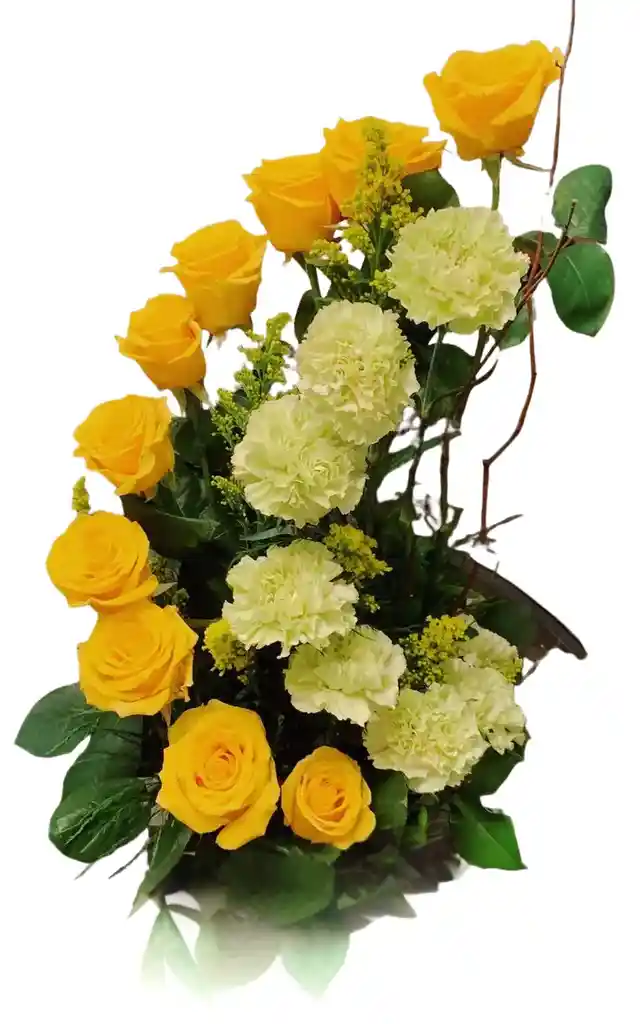 Canasta de 10 rosas amarillas con 8 claveles en forma de espiral. La flor puede ser sustituida dependiendo la disponibilidad de color y del producto “Mensaje Personalizado” máximo de 30 caracteres (Dejar el mensaje en el chat, los comentarios no se previsualizan para la tienda por lo que si se dejan allí no podrá ser incluido).