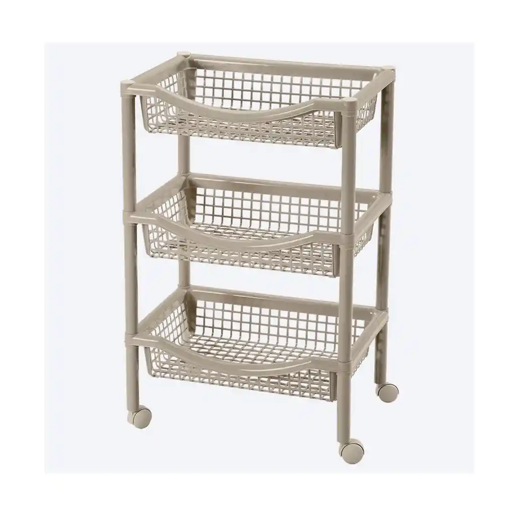 Canasta móvil rectangular que incluye tres niveles para organizar. Tiene rodachinas. Fácil de armar, no requiere herramientas. Ideal para organizar en casa todo tipo de objetos. No se oxida y es fácil de limpiar. Úsala en cocina, baños, cuartos de niños, como organizador auxiliar. Es tejida y permite oxigenar los productos o alimentos que guarde. DETALLES Marca: Rimax Material: Polipropileno Medidas: Alto (72 cm) Ancho (31 cm) Largo (45 cm) Peso: 1.2 kg Colores: Multicolor – Taupe – Blanco Hecho en: Colombia
