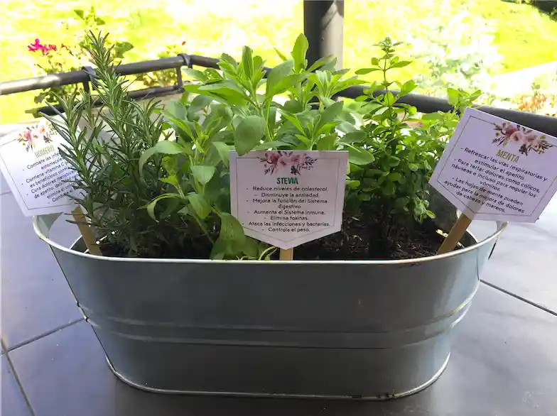 Canasta metalica con 3 aromatics según disponibilidad. Incluye topper con propiedades de cada planta.