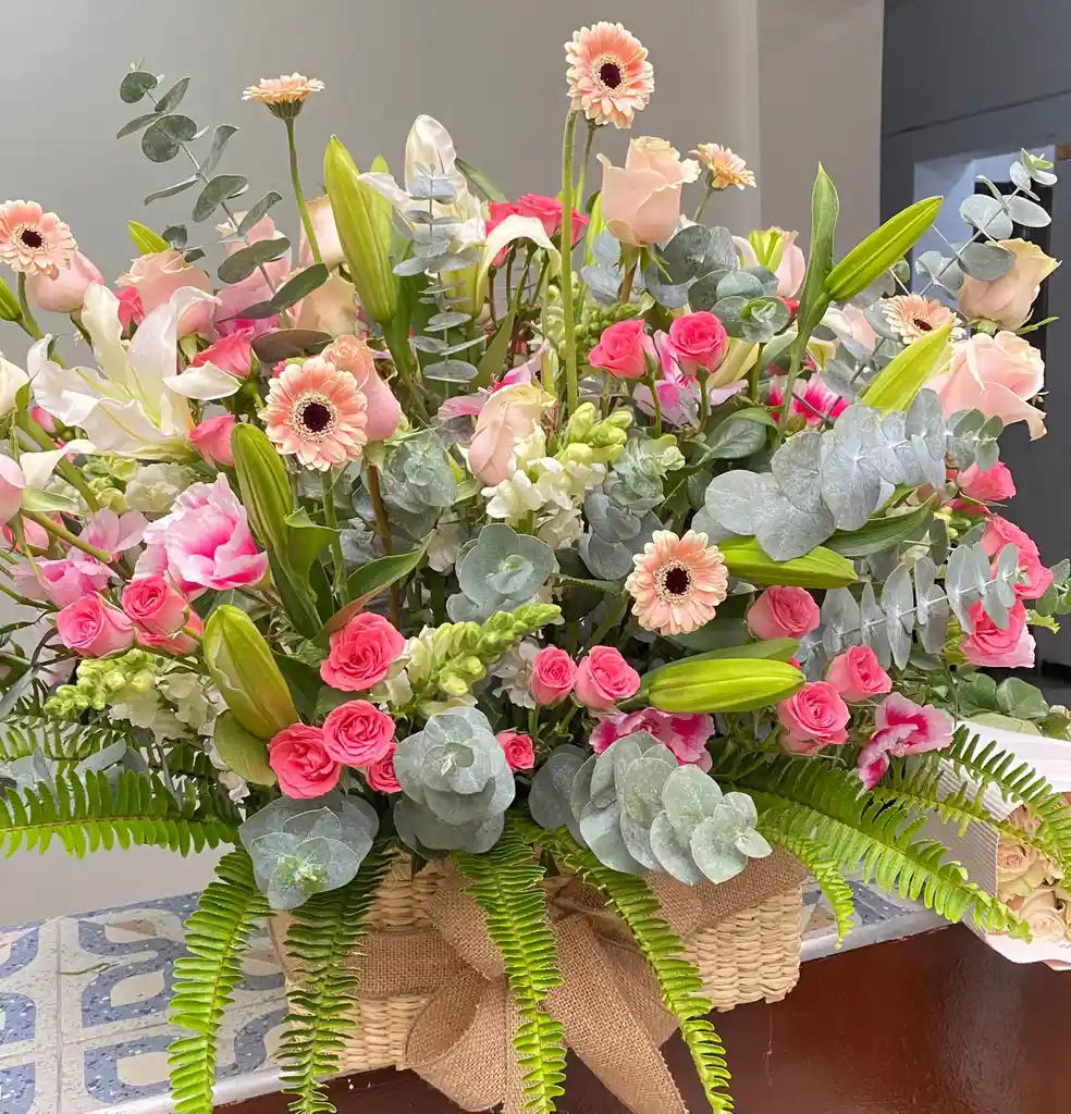contine: 24 rosas del color que desees, 6 minigerberas, follaje fino en eucalipto, y helecho, mini rosas, 3 lirios blancos montado en una canasta de fique y lazo de yute.