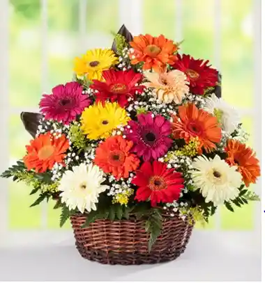 Esta hermosa canasta de flores está elaborada con gerberas de varios colores y montecasino blanco. Ideal para cumpleaños. * En caso de no haber disponibilidad de Gerberas, se enviará una flor similar.