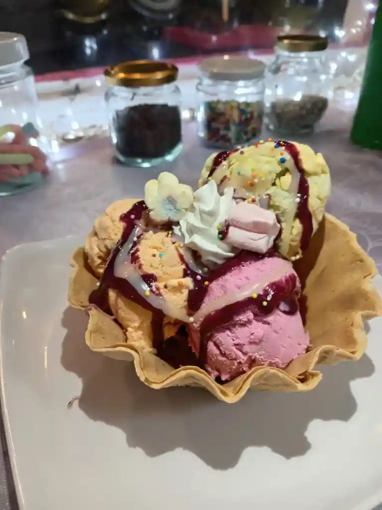 CANASTA DE GALLETA, CON 3 BOLAS DE HELADO, ADICIONADA CON SALSA DE LA CASA ( FRUTOS ROJOS ) OTRA SALSA DE SU PREFERENCIA, GRAGEAS, ESPOLVOREADA CON MILO. PUEDES PERSONALIZAR TUS PRODUCTOS FAVORITOS CON LOS TOPPINS ADICIONALES QUE ENCONTRARAS EN EL MENU, ASI JUNTOS REALIZAREMOS LA COMBINACION PERFECTA PARA CONQUISTAR TU PALADAR.