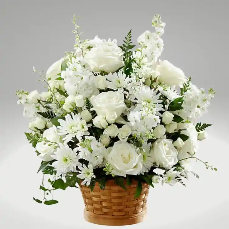 Canasta de mix de flores blancas Un sofisticado diseño en canasta con una armoniosa combinación de flores blancas, transmitiendo paz, pureza y serenidad en un solo detalle floral. Nota: La flor puede ser sustituida dependiendo de la disponibilidad de color y del producto. "Mensaje Personalizado" máximo de 30 caracteres (Dejar el mensaje en el chat, los comentarios no se previsualizan para la tienda, por lo que si se dejan allí no podrá ser incluido).