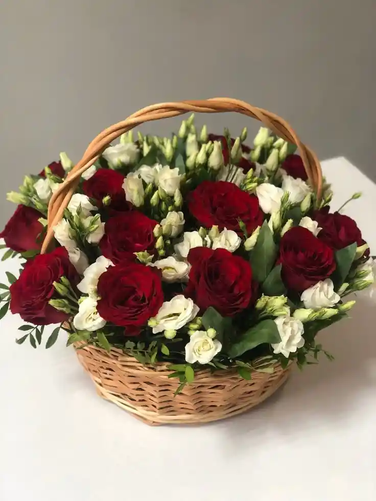 Canasta de 14 rosas rojas y rosa mini blanca Nota: La flor puede ser sustituida dependiendo la disponibilidad de color y del producto “Mensaje Personalizado” máximo de 30 caracteres (Dejar el mensaje en el chat, los comentarios no se previsualizan para la tienda por lo que si se dejan allí no podrá ser incluido).
