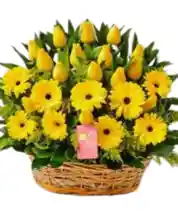 Canasta de 6-8 gerberas aproximadamente, con 12 rosas amarillas. La flor puede ser sustituida dependiendo la disponibilidad de color y del producto “Mensaje Personalizado” máximo de 30 caracteres (Dejar el mensaje en el chat, los comentarios no se previsualizan para la tienda por lo que si se dejan allí no podrá ser incluido).