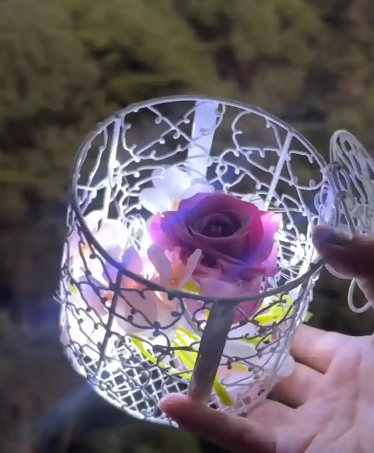 Rosa preservada con hortensias preservadas dentro de una canasta vintage en aluminio blanca decoracion con luces led