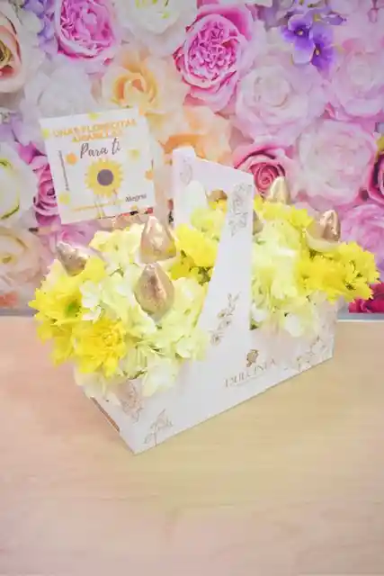 Canasta con flores amarillas naturales 6 fresas bañadas en chocolate