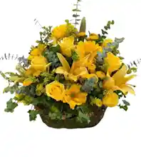 Canasta mix de flores amarillas, con rosas, gérberas y lirios. La flor puede ser sustituida dependiendo la disponibilidad de color y del producto “Mensaje Personalizado” máximo de 30 caracteres (Dejar el mensaje en el chat, los comentarios no se previsualizan para la tienda por lo que si se dejan allí no podrá ser incluido).