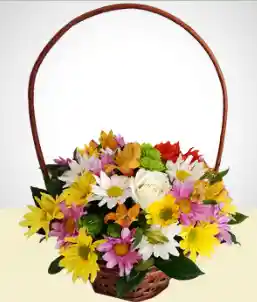 Canasto primaveral en variedad de flores como margaritas y pinoquios. de color Multicolor ideal para el Felicitaciones