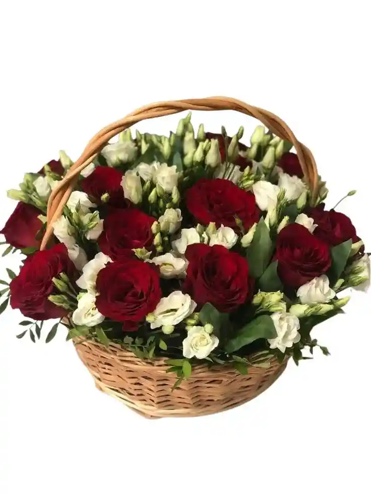 Canasta de 14 rosas rojas y rosa mini blanca con rusco Nota: La flor puede ser sustituida dependiendo la disponibilidad de color y del producto “Mensaje Personalizado” máximo de 30 caracteres (Dejar el mensaje en el chat, los comentarios no se previsualizan para la tienda por lo que si se dejan allí no podrá ser incluido).