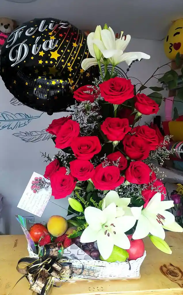 Espectacular canasta blanca con arreglo floral 12 rosas y frutas seleccionadas!