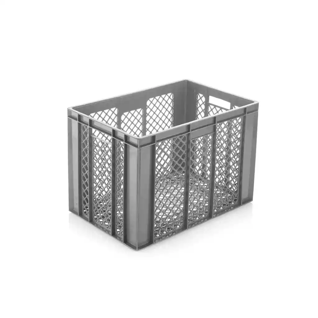 Fabricada en polietileno de alta densidad. 100% reciclable, reutilizable y retornable. Diseño apilable con alta estabilidad. Resistencia nominal hasta 500 kg en apilamiento. Capacidad de carga interna hasta 25 kg. Esquinas reforzadas para mayor durabilidad. Paredes cerradas protegen de polvo y humedad. Fondo liso que optimiza el espacio interno. Resistente a químicos, ácidos y detergentes. Rango térmico de -30°C a 80°C. Fácil limpieza y desinfección. Manijas ergonómicas para mejor manipulación. Ideal para industria, logística y almacenamiento. La imagen ha sido ambientada; no incluye accesorios adicionales y el color puede variar según la iluminación.