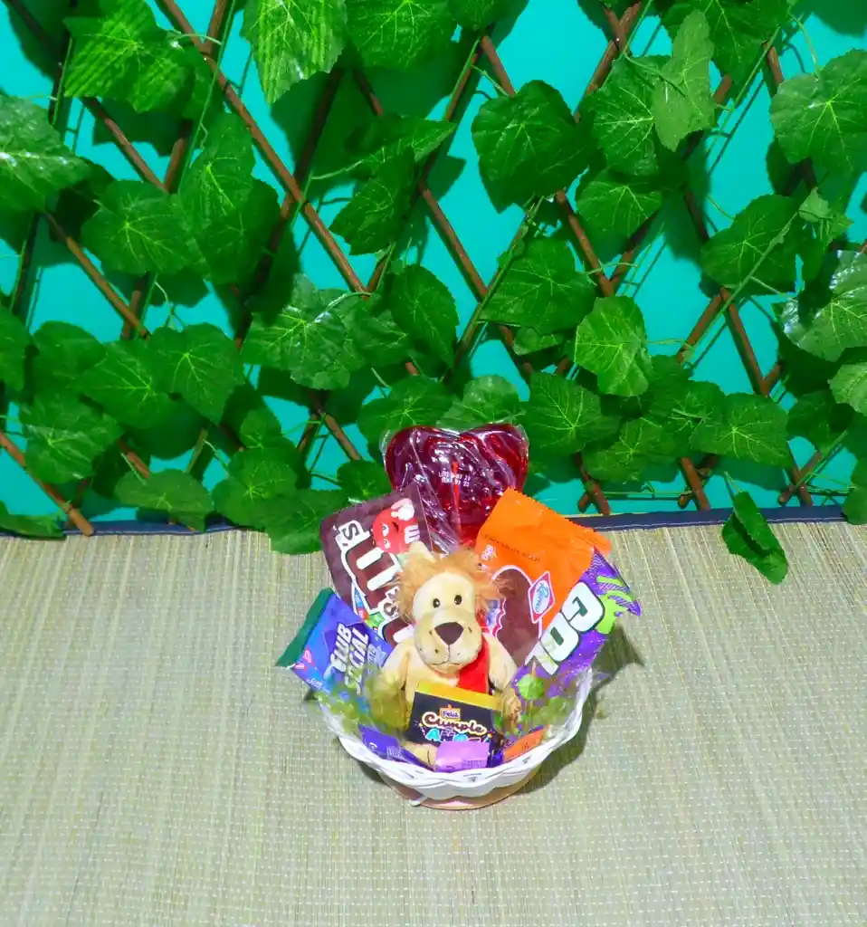 Productos 1 Peluche animalito 1 Chocoramo 1 Colombina en forma de Corazón 1 Chocolates m&m's 1 Chocolate con mensaje pequeño 1 Galletas Club Social 1 Gol 3 Chocolatinas mini jet Accesorios 1 Tarjeta con mensaje impreso papeles decorativos Empaque 1 Canasta 16cm x 15cm aprox Se envuelve en papel tornasol estampado y moño decorativo los colores y motivos pueden varias de acuerdo a disponibilidad o elección del cliente