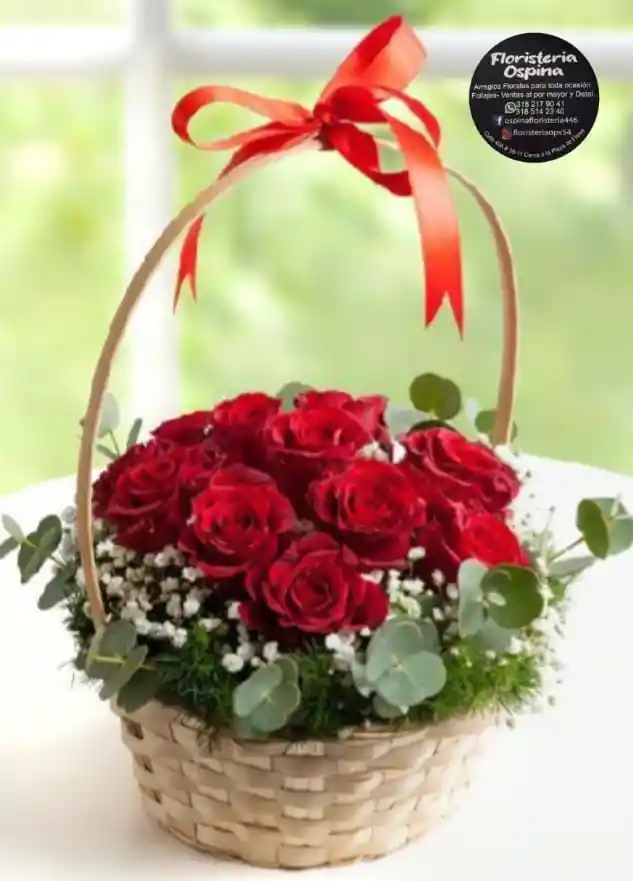 Un toque clásico con alma coqueta… Canasto de Suspiros es un encantador arreglo de rosas rojas que florecen en una cesta rústica adornada con finos detalles verdes y el dulce resplandor de la nube blanca. Coronado con un lazo rojo vibrante, este diseño es perfecto para regalar amor en su forma más delicada y romántica. Ideal para enamorar con ternura, sorprender en una fecha especial o simplemente robar un suspiro sin previo aviso. Si deseas incluir una tarjeta, recuerda solicitarla al momento de tu pedido. Sugerencia de mensaje: "Tú no eres un pensamiento más… eres ese suspiro que no quiero soltar." ❤️🌿 Disponible en Floristería Ospina, donde cada flor se elige con el corazón y cada detalle enamora desde el primer vistazo. (El diseño del moño o la base puede variar según disponibilidad, manteniendo siempre la esencia del arreglo).