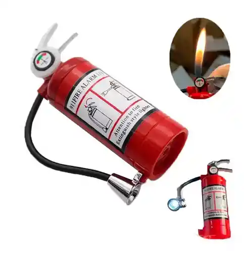 Encendedor tipo extintor, con linterna, metálico, recargable con gas butano.
