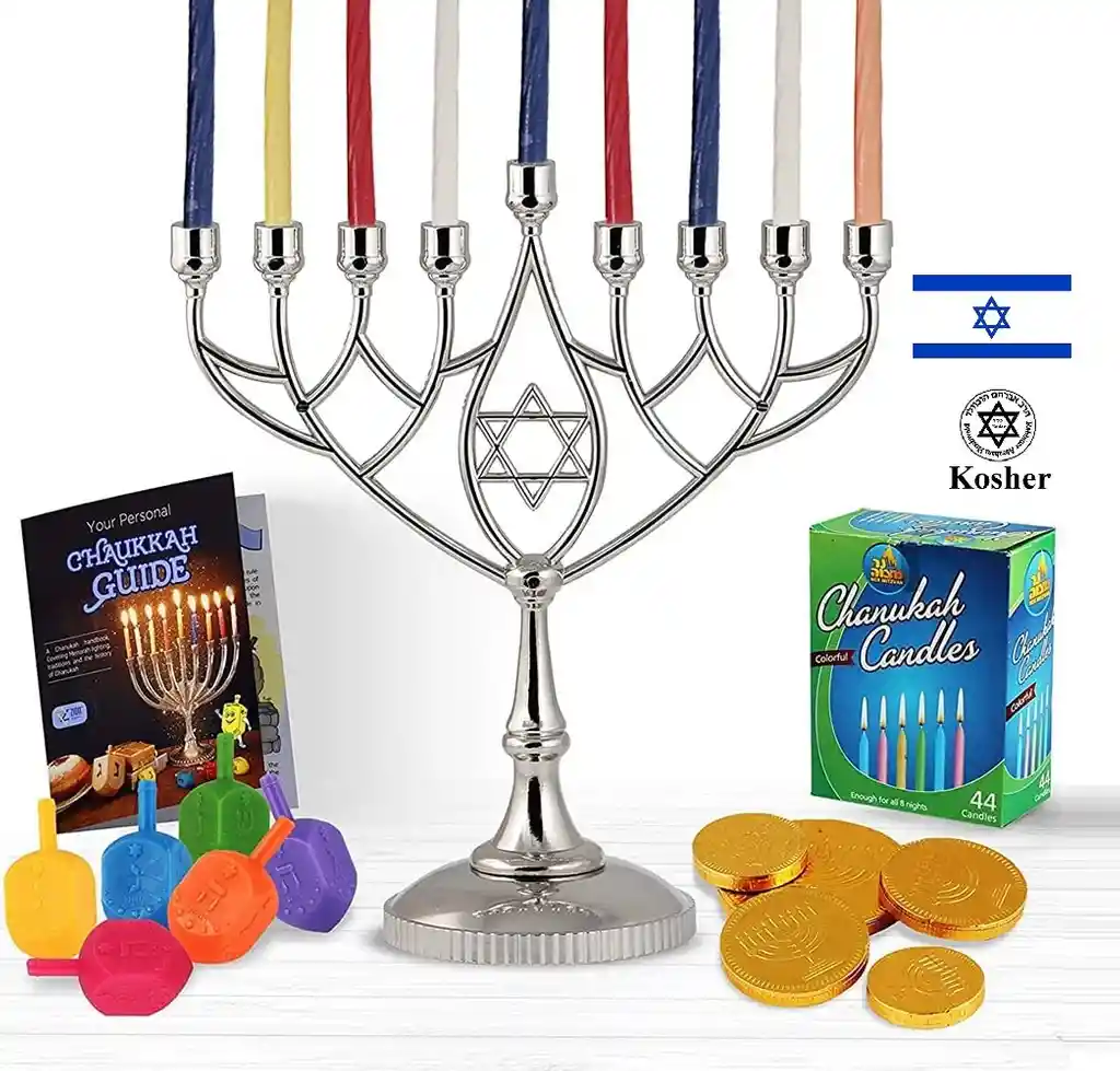 ● Candelabro menorah judaismo zión & kit Hanukkah janucá dreidels monedas menorá judío ● Las velas multicolores clásicas cumplen con todos los requisitos de la ley judía judaica y del pueblo de Israel, alegrarán su experiencia de Janucá. ● Candelabro Menoráh metálico largo 22.8cm x 26cm de alto x 20cm ancho ● ¡Paquete de valor excepcional con cosas realmente buenas! Todo el equipo de Hanukkah en 1 paquete. ● Detén la caza aquí, este juego lo tiene todo. Calidad, Valor, Precio. ● Una menorá sólida metálico y resistente de tamaño completo, caja de 44 velas de colores de Hanukkah, 4 dreidels medianos con transliteración en inglés, ● Monedas de leche de chocolate de Hanukkah belga (5 monedas sin nueces) ● ¡NUEVO! Guía completa de Hanukkah, 8 secciones con todo sobre Janucá.