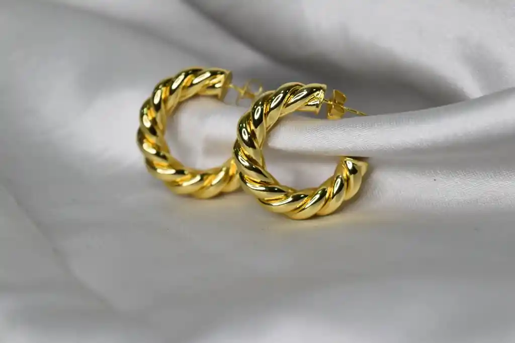 Par de candongas en rodio con diseño entorchado en color dorado. Mide 2.5CM. Ideal para cualquier ocación y para un regalo.