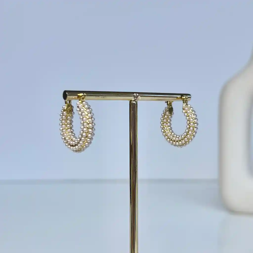 Estas candongas tienen un diseño elegante y moderno, con un acabado que destaca por su delicadeza. Están elaboradas en forma de aro, y su superficie está adornada con pequeñas perlas uniformes que cubren todo el aro. El cierre es tipo pasador, lo que asegura comodidad y seguridad al usarlas.