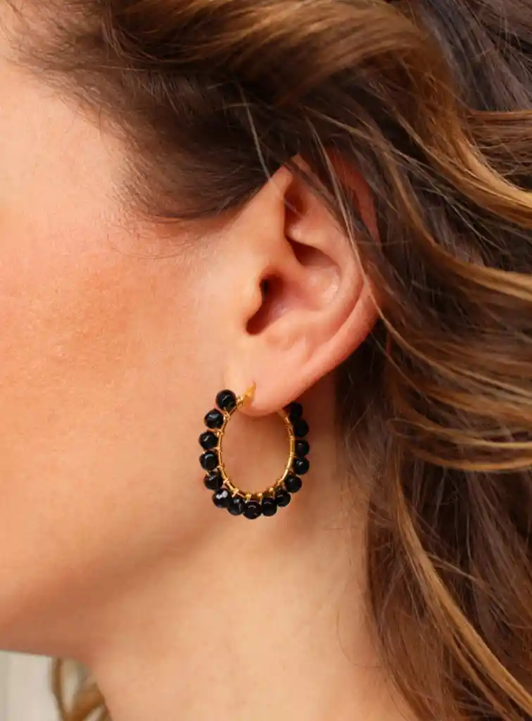 Candongas en acero dorado con cristales negros de Murano, cada pieza está delicadamente tejida con cristal negro de Murano facetado. Son perfectas para completar cualquier look.