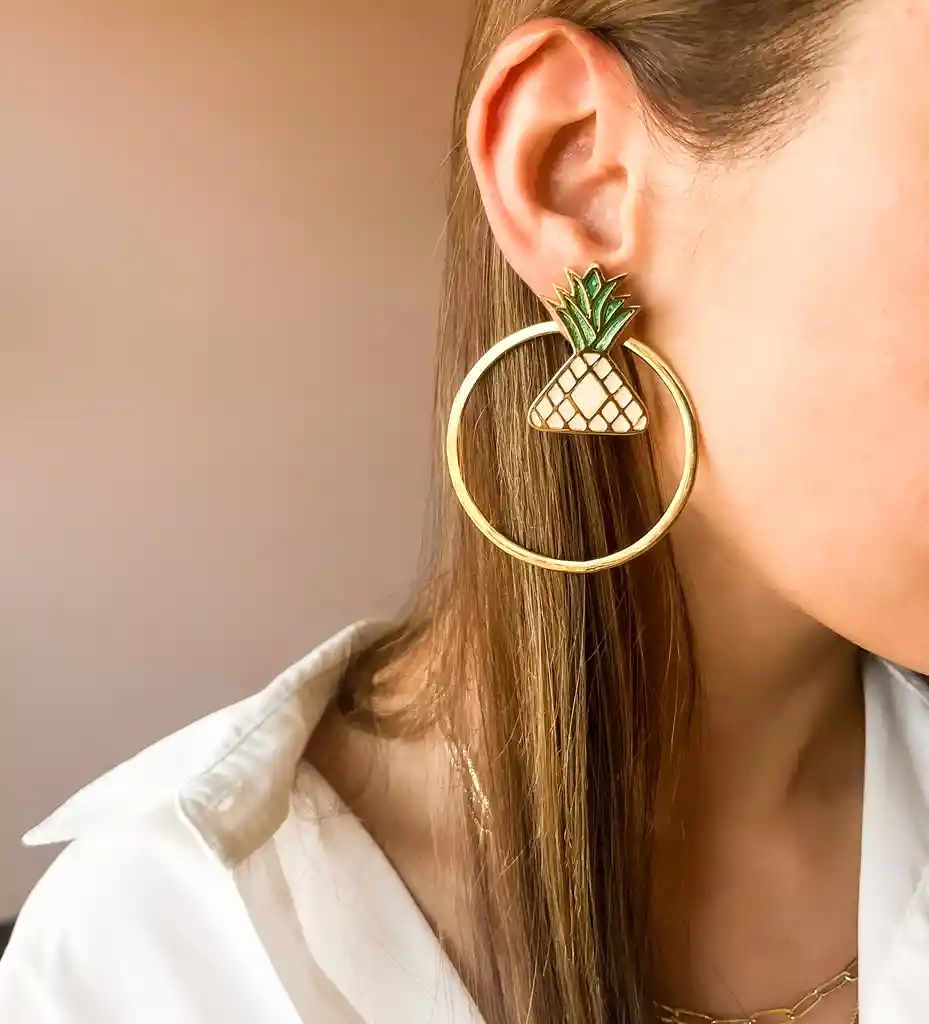 Candongas Piña + Topo Piña Bronce con baño de oro de 24k DOBLE USO: 1- CANDONGA CON CUALQUIER OTRO TOPO 2- SOLO TOPO PIÑA Recomendaciones y cuidados: Para preservar el color te recomendamos no entrar a piscinas o el mar, tampoco aplicar líquidos y químicos tóxicos(perfumes, splash, cremas, alcohol, etc) Almacena tus joyas en los empaques de tela entregados con tus productos. POETRY no garantiza que el baño de oro y cualquier material de nuestros modelos dure para siempre. Las piezas bañadas y chapadas en oro, acero inoxidable, acero titanio, son por defecto, más frágiles y susceptibles de perder el color con el paso del tiempo.