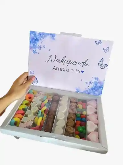 Caja personalizada según temporada o peticion personal, seccionada para dulces variados entre chocolates, gomas dulces o acidas, masmelos, galletas, dulces. tarjeta personalizada