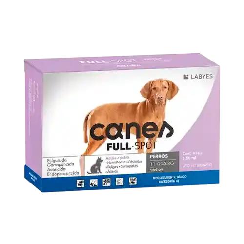 CANES FULL SPOT de LABYES es un desparasitante eficaz diseñado específicamente para perros de 11 a 25 kg, brindando una protección integral contra parásitos externos como pulgas y garrapatas.