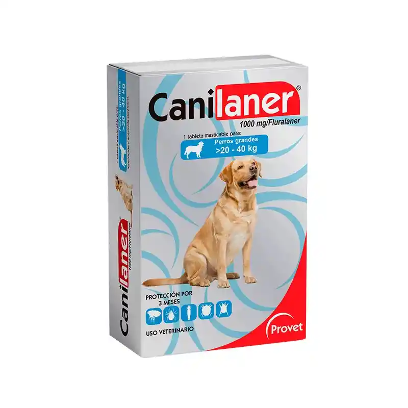 Canilaner es una tableta masticable saborizada para perros que contiene fluralaner, diseñada como un insecticida y acaricida sistémico eficaz. Ofrece protección contra pulgas, garrapatas y ácaros (sarna) durante hasta 12 semanas con una sola dosis. Está disponible en cinco presentaciones según el peso del perro. Características Principales: Acción rápida y prolongada: Protege por 12 semanas (aprox. 3 meses). Amplio espectro: Elimina pulgas (Ctenocephalides spp.), garrapatas (Rhipicephalus, Ixodes, Dermacentor) y ácaros (Demodex, Sarcoptes, Otodectes). Palatable: Tableta masticable con sabor apetecible para perros. Uso: Exclusivo en caninos, con presentaciones para diferentes pesos (desde 2 kg hasta 56 kg).