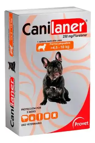 Canilaner es unatableta masticable saborizada para perros que contiene fluralaner micronizado, indicada como insecticida y acaricida sistémico de acción prolongada. Ofrece protección efectiva por hasta 12 semanas (casi 3 meses) contra pulgas, garrapatas y ácaros de la sarna. Es un producto de Laboratorios Provet, disponible en cinco presentaciones según el peso del canino.