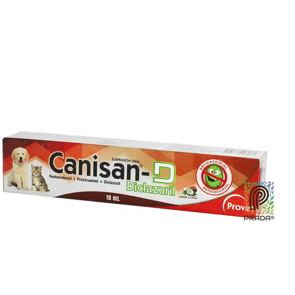 Canisan D ® es un Antihelmíntico y Antiprotozoario para perros y gatos formulado para actuar en contra de las parasitosis, giardiosis y coccidiosis que pueden afectar el aparato digestivo de estas mascotas. Esta suspensión oral de fácil suministro gracias a su agradable sabor a coco, será eficaz en el tratamiento y control de los protozoarios que intervienen en las afectaciones nerviosas y reproductivas que suelen padecer los perros y los gatos. Así que su efecto será eficaz al actuar en contra de parásitos como: Toxocara canis, T. leonina, Ancylostoma caninum, Taenia pisiformis, Capillaria aerophilia, Filaroides hirthi, entre otros. Además, será efectivo en el tratamiento en contra de la Giardia intestinalis quísticas. - Suspensión oral con agradable sabor a Coco. - Antihelmíntico y antiprotozoario para perros y gatos que actuará eficazmente en el tratamiento y control de la coccidia y giardiosis. - Contiene Fenbendazol, Prazicuantel y Diclazuril. ¿Cómo Suministrar Canisan D ® en Perros y Gatos? Canisan D ® será de fácil suministro ya que es una suspensión oral con agradable sabor a coco. Para saber la dosis correcta debes pesar a tu perro, ya que Canisan D viene en 3 diferentes presentaciones: 10 ml, 5 ml y 2.5 ml. - Para el control Antiparásitario debes suministrar: 1 ml de Canisan por cada 5 Kg de peso. - Para el tratamiento de la coccidia debes suministrar: 1 ml de Canisan por cada 5 Kg de peso cada 24 horas durante 2 días. - Para el tratamiento de la giardiosis debes suministrar: 1 ml de Canisan por cada 5 Kg de peso cada 24 horas durante 3 a 5 días. Composición Cada mL de CANISAN®-D contiene: Fenbendazol 250 mg Prazicuantel 50 mg Diclazuril 75 mg Excipientes c.s.p 1 mL