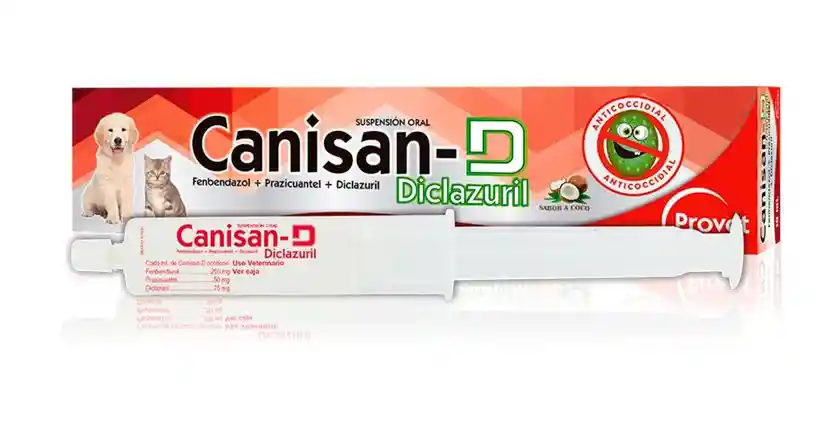 CANISAN-D CANISAN®-D es un antihelmíntico – antiprotozoario para el tratamiento y control de las principales parasitosis, coccidiosis y giardiosis, que afectan el sistema digestivo de perros y gatos. Su composición permite el control de Neosporosis y toxoplasmosis, y otros protozoarios involucrados en afectaciones nerviosas y reproductivas en los perros y gatos. INDICACIONES CANISAN®-D En perros y gatos para el tratamiento y control de parasitismo ocasionado por: Toxocara canis, T. leonina, Ancylostoma caninum, Uncinaria stenocephala, Trichuris vulpis, Taenia pisiformis, Dipylidium caninum, Echinococcus granulosus, para tratar también infecciones por Capillaria aerophilia, Filaroides hirthi y Paragonimus kellicotti. Útil en el tratamiento y prevención de la coccidiosis por Cystoisospora canis, Cystoisospora felis (anteriormente conocido como Isospora canis y felis). Es efectivo contra infecciones por Giardia intestinalis quísticas y activas (todos los genotipos de trofozoitos). DOSIS Y VÍA DE ADMINISTRACIÓN CANISAN®-D Administrar vía oral a una dosis de 50 mg/kg de Fenbendazol, 10 mg/kg de Prazicuantel, 15 mg/Kg de Diclazuril. En la práctica administrar 1 mL de la jeringa por cada 5 Kg de peso, para el control y programa sanitario antiparasitario en perros y gatos. Para el tratamiento de coccidia: Vía oral, 1 mL de la jeringa por cada 5 Kg de peso, cada 24 horas, durante dos días seguidos y se repite el día 7 y 14 en perros y gatos. Para el tratamiento de giardiosis: Vía oral, 1 mL de la jeringa por cada 5 Kg de peso, cada 24 horas, durante 3 - 5 días consecutivos en perros y gatos.