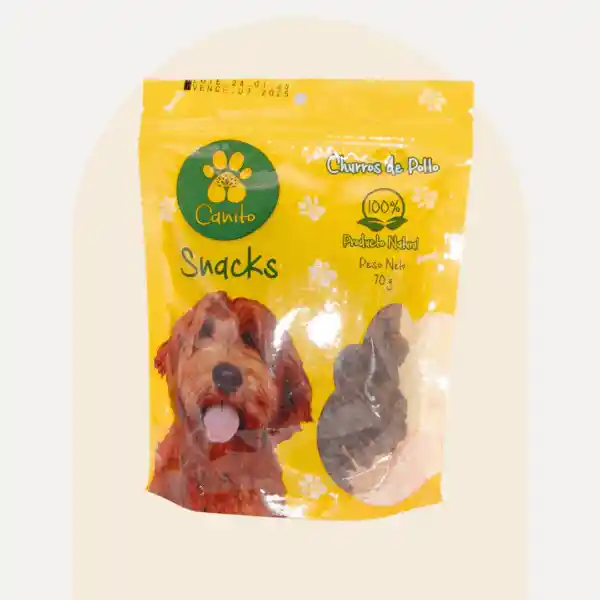 Premia y entrena a tu mascota con Canito Snack. Canito Churros de Pollo 70 gr Sin Aditivos 100% Ingredientes naturales No contiene carnaza Fabricado en Colombia