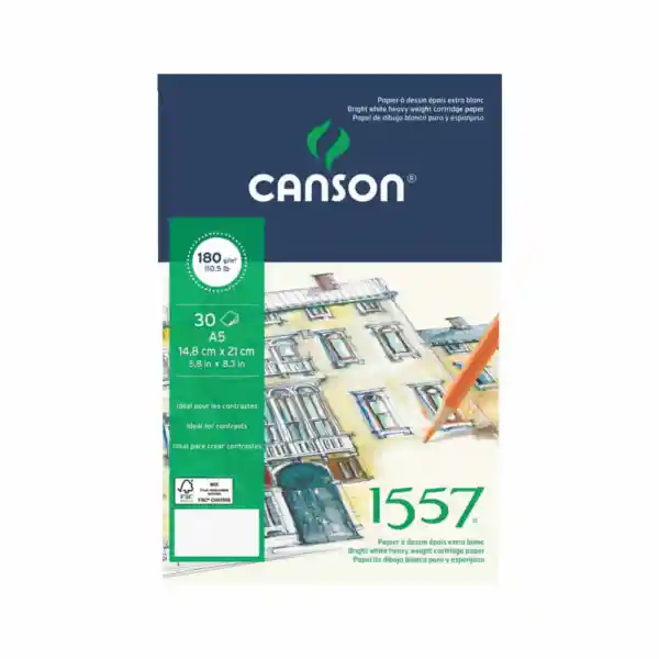 Block 1557 Diseño Canson A5 Enlomado Papel de Dibujo Blanco Puro y Esponjoso Ideal Para Lápiz, Pastel, Carboncillo, Gouache, Tinta, Entre Otros. Papel de 180 g. Que Resiste el Borrado Repetitivo Sin Deteriorarse. Blanco Natural. Grano Ligero. Libre de Ácido. Presentación A5 30 Hojas.