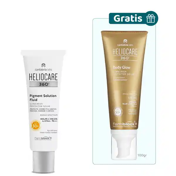 Kit contiene 2 Unidades. Protector Solar 360 1 Und + Protector Solar Body Glow 100 g. Este Kit Incluye: Heliocare 360 Pigment Solution Fluid Spf 50 - Cantabria Labs 50 mL: Fotoprotección Muy Alta de Amplio Espectro Que Protege Frente a Las Cuatro Radiaciones Uvb-Uva-Vl-Ira Incluso Frente a Luz Azul Emitida Por Dispositivos Digitales. Sus Sistemas Antipolución y Despigmentante Ayudan a Prevenir y Corregir Las Manchas Oscuras y Manchas Solares Con Pigmentos Nude Para Unificar el Tono de la Piel. Su Textura Ultraligera Ideal Para Todo Tipo de Pieles Deja un Acabado Suave y Sedoso. Resistente al Agua y al Sudor no Pica en Los Ojos. Cumple Las Más Altas Exigencias en Materia de Fotoprotección. Su Fórmula Con Filtros Específicos y Fernblock + Protege Frente a Las 4 Radiaciones (Uvb Uva Visible e Infrarroja) Con Actividad Avanzada Frente a Radiación Uva Luz Visible y Luz Azul Para Una Óptima Prevención de Las Manchas Solares. Además Fernblock + Junto Con Los Activos Reparadores y Antioxidantes Neutralizan y Reparan el Daño Solar. Alta Tolerancia Cutánea. Testado Bajo Control Dermatológico y Oftalmológico. Gratis Heliocare 360 Body Glow Spf50 + - Cantabria Labs 100 mL: Fotoprotección Corporal Que Embellece la Piel. Brilla el Sol Brilla tu Piel. Muy Alta Fotoprotección Corporal Para Prevenir el Daño Solar y Los Signos de Envejecimiento Asociados a Éste. Esta Fórmula Con Una Innovadora Textura en Oleogel Cremoso Incluye Además de la Avanzada Ciencia Fotoprotectora de Heliocare Una Exclusiva Combinación de 6 Micas Que Aportan a la Piel un Acabado Dorado Brillante Apto Para Todos Los Tonos de Piel.