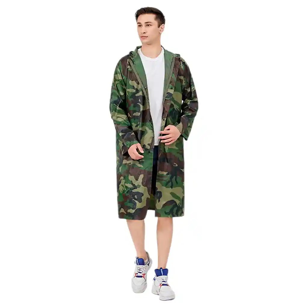 Es una chaqueta hecha de una membrana impermeable que protege de la lluvia y el viento. Tiene capucha, bolsillos con cremallera y puños y bajo ajustables. Tiene un patrón de camuflaje que se mimetiza con el entorno natural. Es ligero, transpirable y duradero. Talla: Unica Adultos. Color: Camuflado. Capucha: SI. Cierres y Broches.