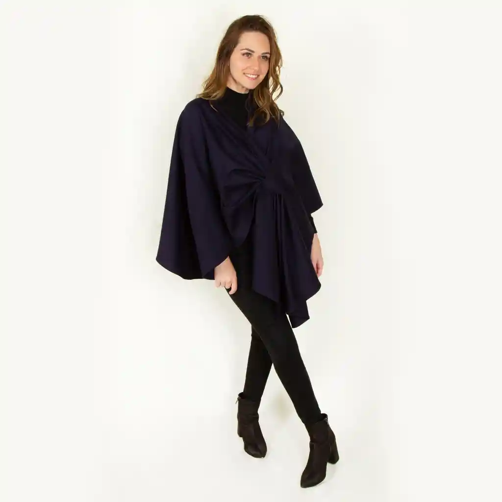 “Nuestra capa Mapa es mi referencia más vendida. Muchas de ustedes la adoran porque es súper versátil y talla única entonces se la compran para ustedes pero también es un regalo muy especial! Con el pasador puedes insertar todo un costado y ajustarla. Puedes dejarla tan larga o corta como quieras y también crear looks asimétricos y dejar el pasador en la mitad y pasar un costado sobre el hombro opuesto para que quede más elegante y cortica. No te preocupes que viene con un instructivo para que le saques el mayor provecho posible, para viajar es espectacular porque queda súper compacta hasta en tu cartera y no necesitas más que esta porque durante 6 días te la puedes poner de las 6 formas y no te vas a ver igual. Es más liviana que la capa Olivia pero también abriga menos.