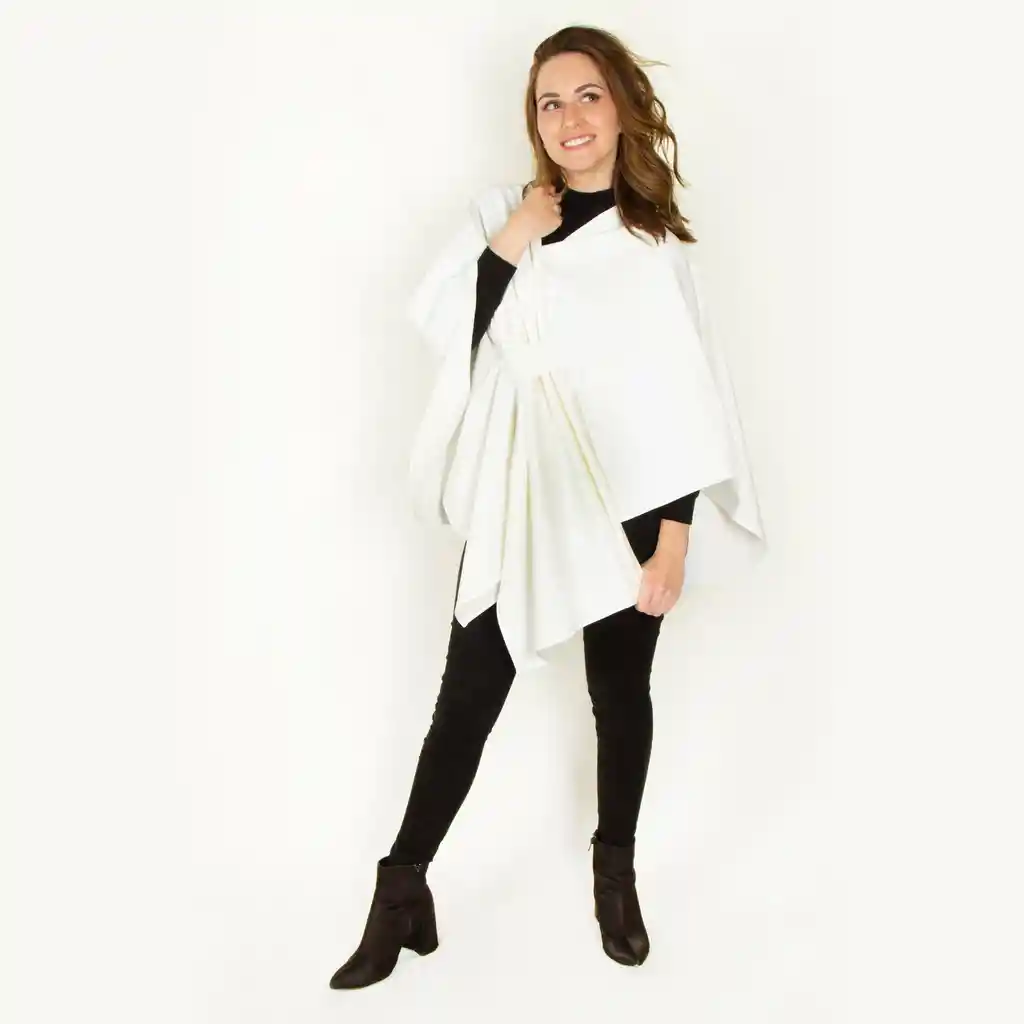 “Nuestra capa Mapa es mi referencia más vendida. Muchas de ustedes la adoran porque es súper versátil y talla única entonces se la compran para ustedes pero también es un regalo muy especial! Con el pasador puedes insertar todo un costado y ajustarla. Puedes dejarla tan larga o corta como quieras y también crear looks asimétricos y dejar el pasador en la mitad y pasar un costado sobre el hombro opuesto para que quede más elegante y cortica. No te preocupes que viene con un instructivo para que le saques el mayor provecho posible, para viajar es espectacular porque queda súper compacta hasta en tu cartera y no necesitas más que esta porque durante 6 días te la puedes poner de las 6 formas y no te vas a ver igual. Es más liviana que la capa Olivia pero también abriga menos.