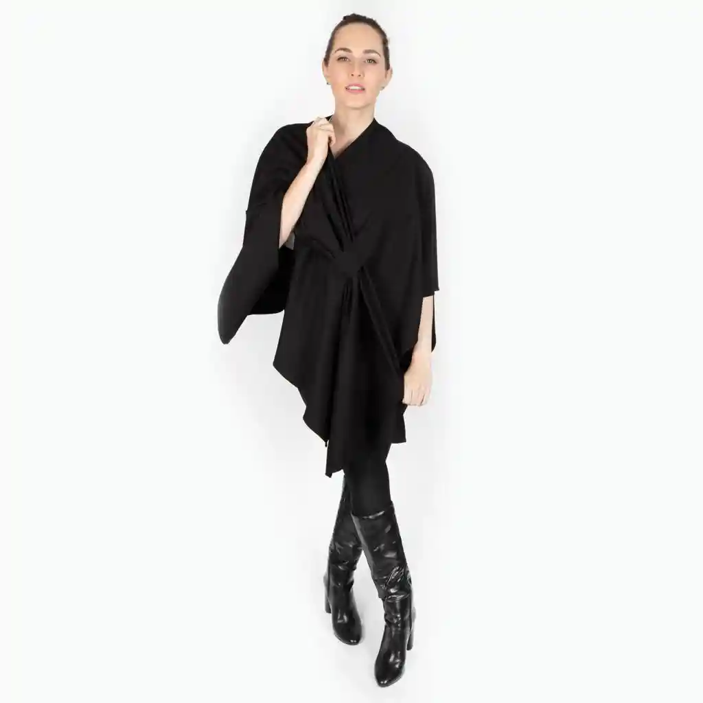 “Nuestra capa Mapa es mi referencia más vendida. Muchas de ustedes la adoran porque es súper versátil y talla única entonces se la compran para ustedes pero también es un regalo muy especial! Con el pasador puedes insertar todo un costado y ajustarla. Puedes dejarla tan larga o corta como quieras y también crear looks asimétricos y dejar el pasador en la mitad y pasar un costado sobre el hombro opuesto para que quede más elegante y cortica. No te preocupes que viene con un instructivo para que le saques el mayor provecho posible, para viajar es espectacular porque queda súper compacta hasta en tu cartera y no necesitas más que esta porque durante 6 días te la puedes poner de las 6 formas y no te vas a ver igual. Es más liviana que la capa Olivia pero también abriga menos.
