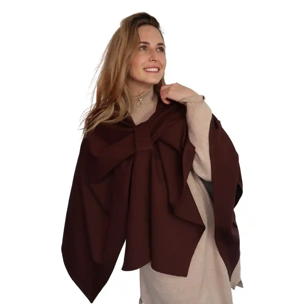 “Nuestra capa Mapa es mi referencia más vendida. Muchas de ustedes la adoran porque es súper versátil y talla única entonces se la compran para ustedes pero también es un regalo muy especial! Con el pasador puedes insertar todo un costado y ajustarla. Puedes dejarla tan larga o corta como quieras y también crear looks asimétricos y dejar el pasador en la mitad y pasar un costado sobre el hombro opuesto para que quede más elegante y cortica. No te preocupes que viene con un instructivo para que le saques el mayor provecho posible, para viajar es espectacular porque queda súper compacta hasta en tu cartera y no necesitas más que esta porque durante 6 días te la puedes poner de las 6 formas y no te vas a ver igual. Es más liviana que la capa Olivia pero también abriga menos.